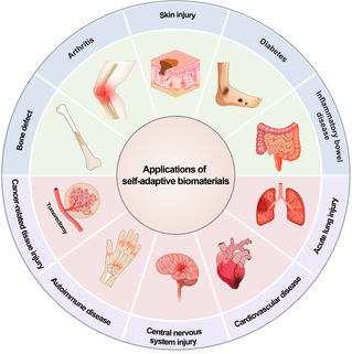 目前用于炎症微环境调控的自适应性生物材料主要分为两类(图4)。一类是含有适应性共价化学基团的生物材料(如pH/缺氧/ROS/糖/酶适应性生物材料),该类材料可以直接与组织微环境中不利的炎症信号分子发生反应,消除其不利影响,同时材料发生相应的降解。另一类是通过动态非共价键相互作用(如主客体/亲疏水/氢键/离子键)实现自适应相互作用,该类材料的降解及其中药物的释放速率与组织修复过程一致。目前自适应性生物材料已经广泛用于多种疾病的治疗(图5)中,如组织损伤、糖尿病、自身免疫疾病、癌症相关的组织损伤等。
