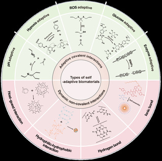 自适应性生物材料主要聚焦于生物材料与病理微环境之间的动态、自适应相互作用(图1)。在组织损伤后,组织微环境发生病理性变化(如过表达炎症因子、活性氧自由基(ROS)、基质金属蛋白酶(MMPs),pH降低,缺氧等),自适应性生物材料可以感受这些炎症生物信号并与之发生适应性反应,降低组织微环境中不利的炎症信号分子浓度,同时材料发生对应性降解或者释放药物,从而调控组织微环境向修复状态发展,以刺激机体自身的修复再生能力。当组织微环境恢复稳态后,材料中的自适应基团对组织微环境不再敏感,以相对稳定的状态存在。当组织再次损伤时,来自剩余材料中的自适应基团会重启与组织炎症信号分子的适应性生物反应。