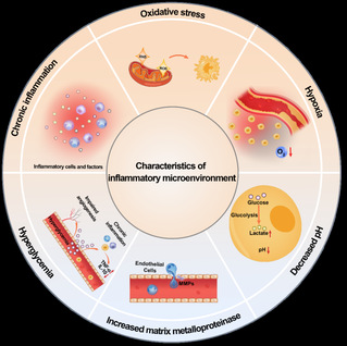 自适应性生物材料的设计以组织损伤后炎症病理微环境(图2)为基础和目的。目前主要的病理微环境特征(图3)包含慢性炎症反应、氧化应激、缺氧、pH降低、MMPs增多等,在糖尿病相关疾病中高糖也是十分重要的典型的病理微环境。
