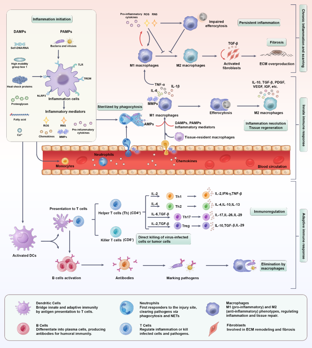图1. 组织损伤后,组织炎症微环境与自适应性生物材料间的自适应相互作用。